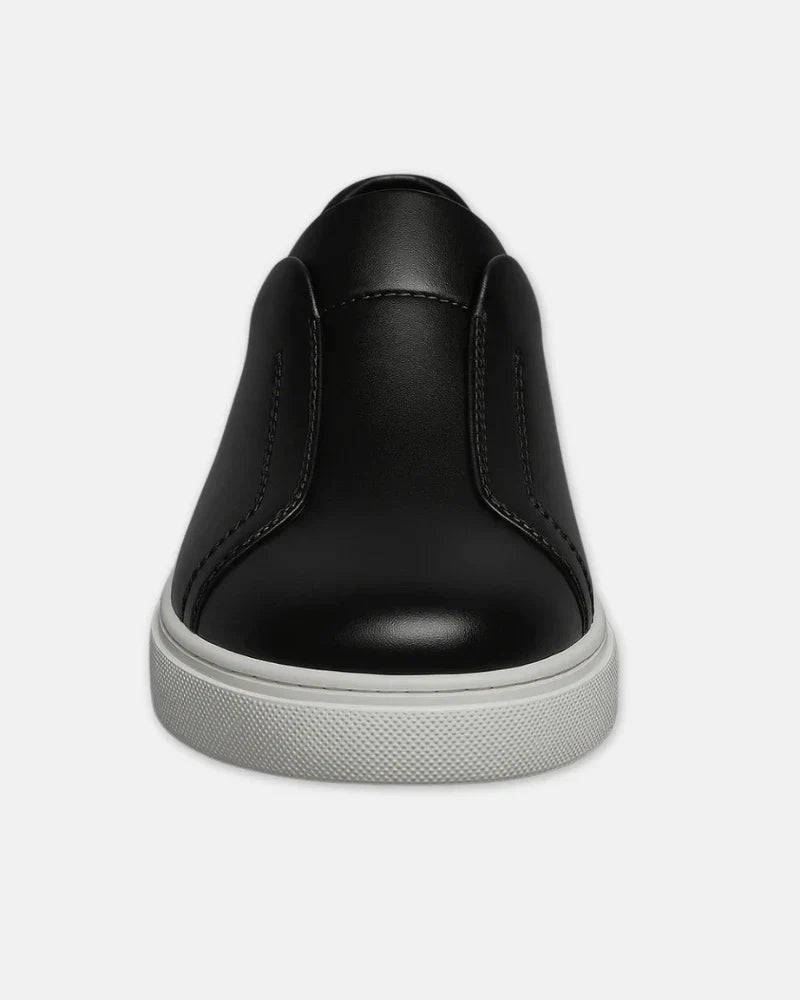 A modern interpretation of a classic sneaker features a smooth, premium leather upper with subtle stitching details and a no-lace design.